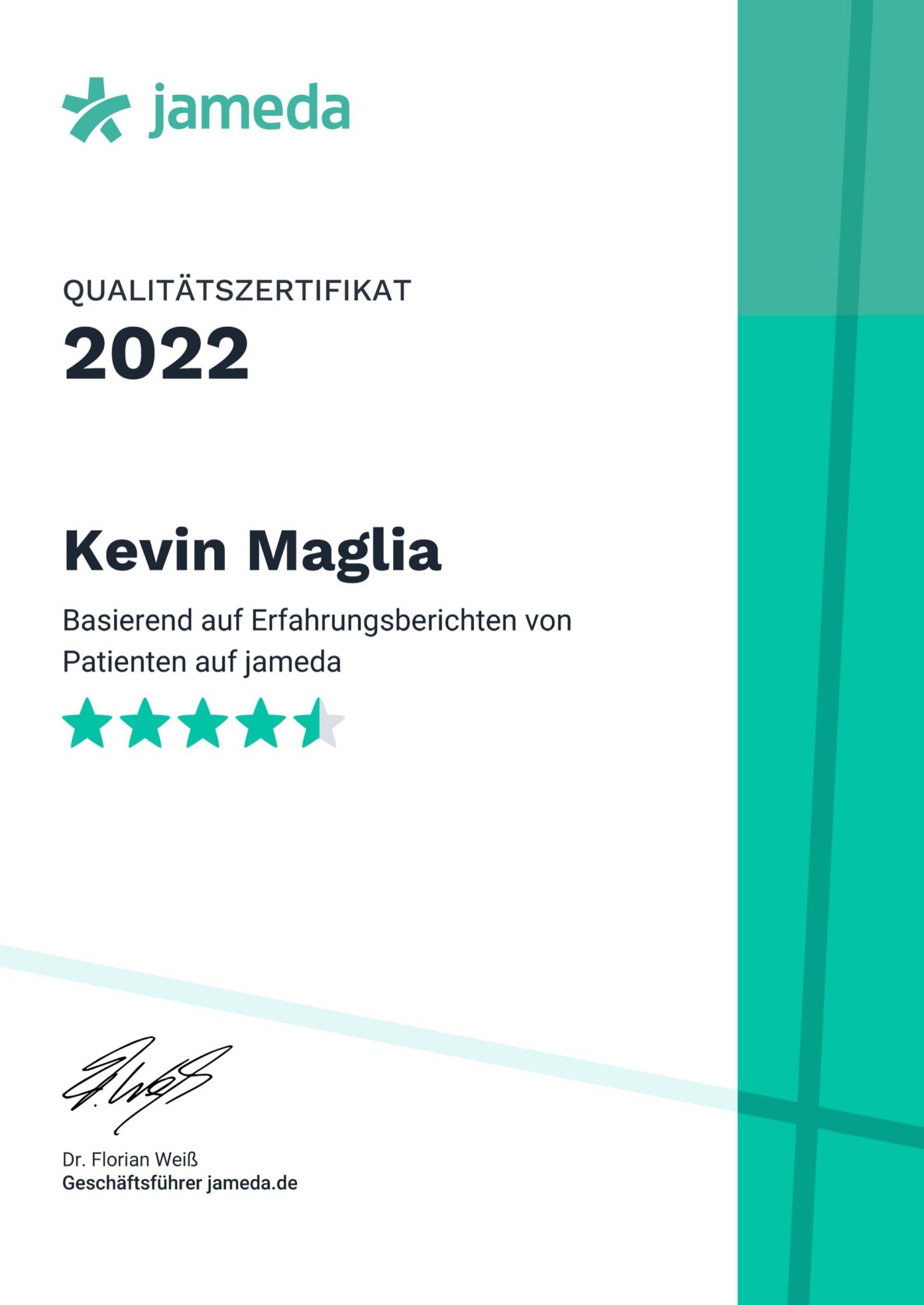 Erfolgreiche Präventionsmedizin ist Evidenz-basiert und baut auf wissenschaftlich belegter Grundlage, sodass Prognose verbessert wird. Dies betrifft heute nicht mehr nur die Lebenserwartung, sondern vornehmlich auch die Lebensqualität (sog. DALYs = „disability-adjusted life years“). Es soll nicht nur dem Leben mehr Jahre gegeben werden, sondern den Jahren auch mehr Leben. Eine weitere Erfolgsgarant ist die Empathie des präventionsmedizinisch Tätigen, denn Wissenschaft alleine (etwa ein trockener Theoretiker) holt ein Individuum für eine Lebensstilmodifikation nicht ab. Persönlichkeit, nicht nur Person, dies mit Emotion bringt Antrieb, ohne dem es nicht geht. Herr Maglia ist hierfür ein professionelles Beispiel: In der Gründung seines „MedicalSports“ tritt er als solch eine präventionsmedizinische Persönlichkeit aktiv auf. Er passt auch komplementäre Ansätze wie die der Osteopathie und generell der Heilpraktik in fundierte Grundstrukturen ein, dies immer nach Erhebung der medizinischen Befunde und persönlichem Kennenlernen der Menschen, die sich an ihn und sein Team wenden. Somit entsteht in jedem einzelnen Fall ein individuelles Konzept, das wir heute in der Personalisierten Medizin als essentiell ansehen. Von daher arbeite ich mit Kardiologischer Praxis und dem European Prevention Center (EPC) (Check-Up-Medizin) gerne mit ihm zusammen. Die positiven Rückmeldungen der Zuweisungen bestätigen die Kooperation.